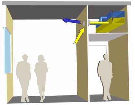 Kombinierter Zu- und Abluft-Wandluftdurchlass KUD2-ZLAL. Zuluft: Der obere Teil des Durchlasses ist mit steckbaren, allseitig verstellbaren Kügeldüsen bestückt. Abluft: Im unteren Teil des Durchlasses mit Lochperforierung.